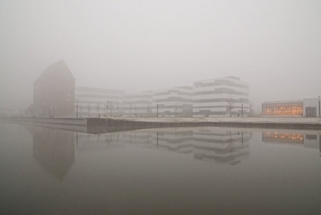Eine dichte „Suppe“ aus Nebeldunst verschleiert auch die Ansicht auf die Hochschule Rhein-Waal am alten Hafengebiet.