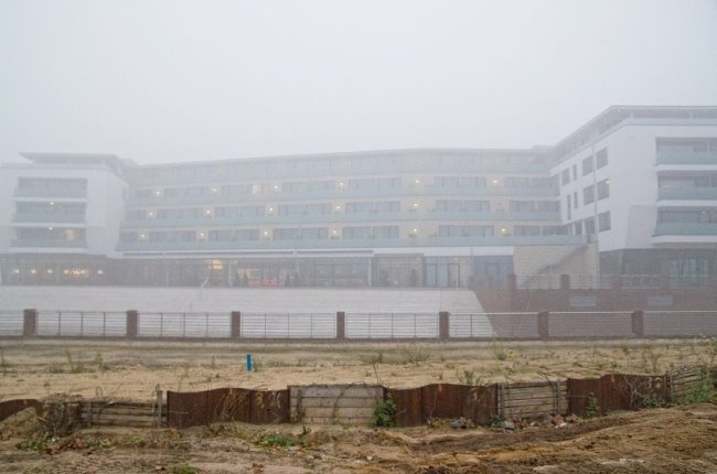 Schemenhaft erkennt man im typisch niederrheinischen Herbstwetter das neue Stadthotel Rilano.