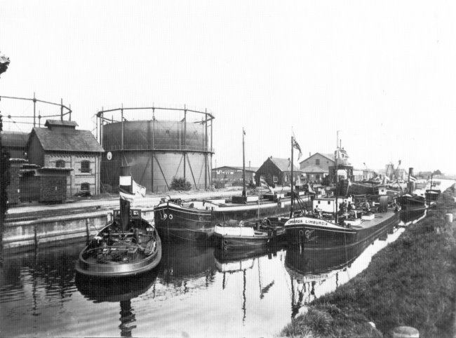 Wir sehen hier einen regelrechten Stau im Klever Hafen. Emsig und betriebsam ging es seinerzeit dort zu, als die Versorgung der großen Klever Werke über den Wasserweg erfolgte. Den Namen des rechten Schiffes kann man noch gut erkennen: „Limburgia“, was auf das Herkunftsland Niederlande hindeutet.