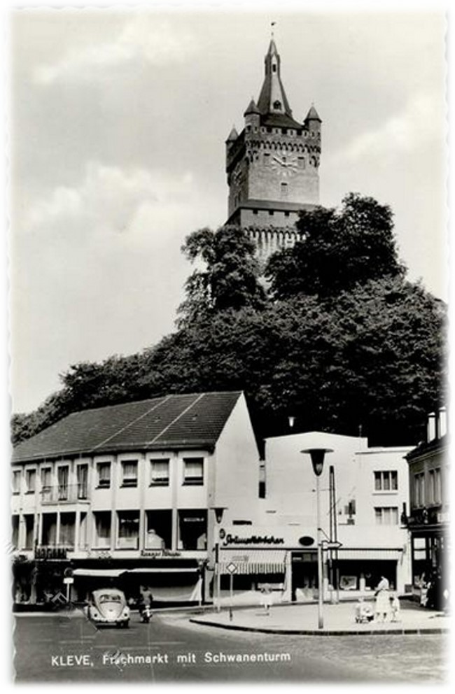Als der Fischmarkt noch offizielle Durchgangsstraße für den Autoverkehr war und keinen Elsa-Brunnen besaß, gab es dort auch das legendäre „Strumpfkörbchen“. Wir sehen den Laden in der Bildmitte. Es wird nicht wenige Klever:innen geben, die sich noch an diesen Anblick erinnern werden.