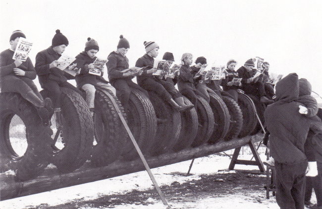 Als Anfang der Fünfziger die Comic-Welle auch über Kleve rollte, gab es für die Kinder und Jugendlichen kein Halten mehr, wie man hier eindrucksvoll erkennen kann. Die Kinder haben es sich gemütlich auf Autoreifen bequem gemacht, um die neusten Bildergeschichten zu lesen.