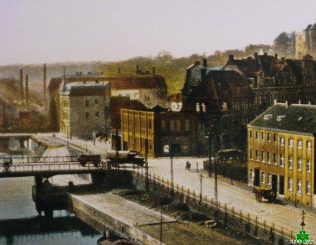Wer es nicht wusste oder kennt, der käme kaum auf die Idee, dass es sich auf diesem kolorierten Bild um Kleve handelt. Der LKW mit Hänger fährt gerade über die Herzogbrücke. Über ihm sieht man das Gebäude des Hotels „Clever Hof“ am Brücktor. Das Spoy-Ufer sah wesentlich anders aus mit der gemauerten Mole, die sich vom Hafen bis hierher zog. Das es tatsächlich Kleve ist, erkennt man rechts oben an der Teilansicht der Schwanenburg. 😉