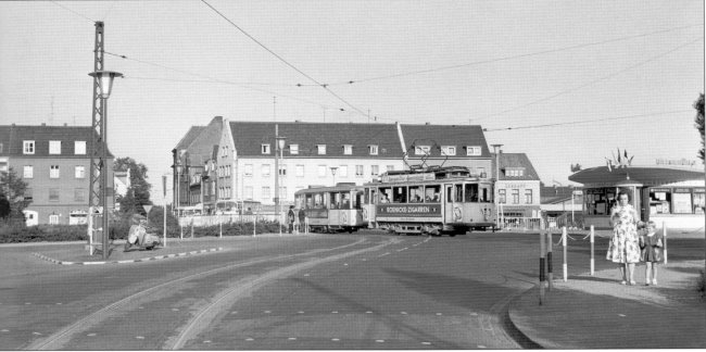 Im Jahre 1960 sieht man hier gerade die Straßenbahn vorbei am Verkehrspavillon die Herzogbrücke verlassen und in die Herzogstraße einbiegen. Ein herrliches Bild vom Anfang der „Golden Sixties“ in Kleve. Auch an dem Sommerkleid der jungen Dame zu erkennen, die hier mit ihrer Tochter spazieren geht.