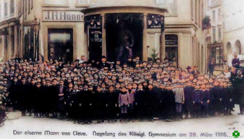 Oder hatte jemand schon mal von der Nagelung des Königlichen Gymnasiums gehört, die, wir wir dieser alten Ansichtskarte entnehmen können, im Jahre 1915 stattfand? Im Pavillion sieht man den Eisernen Mann, der ja ursprünglich aus Holz geschaffen wurde und nur durch das kostenpflichtige Einschlagen von Nägeln letztlich eisern wurde. Das dabei einkassierte Geld sollte in irgendeiner Weise für den ersten Weltkrieg verwendet werden. Toller Spaß. Auffällig ist auch die Anzahl der wohl gleichaltrigen Schüler:innen, die es heutzutage wohl nicht mehr so gibt. Außen rechts entdeckt man tatsächlich auch zwei Schülerinnen.