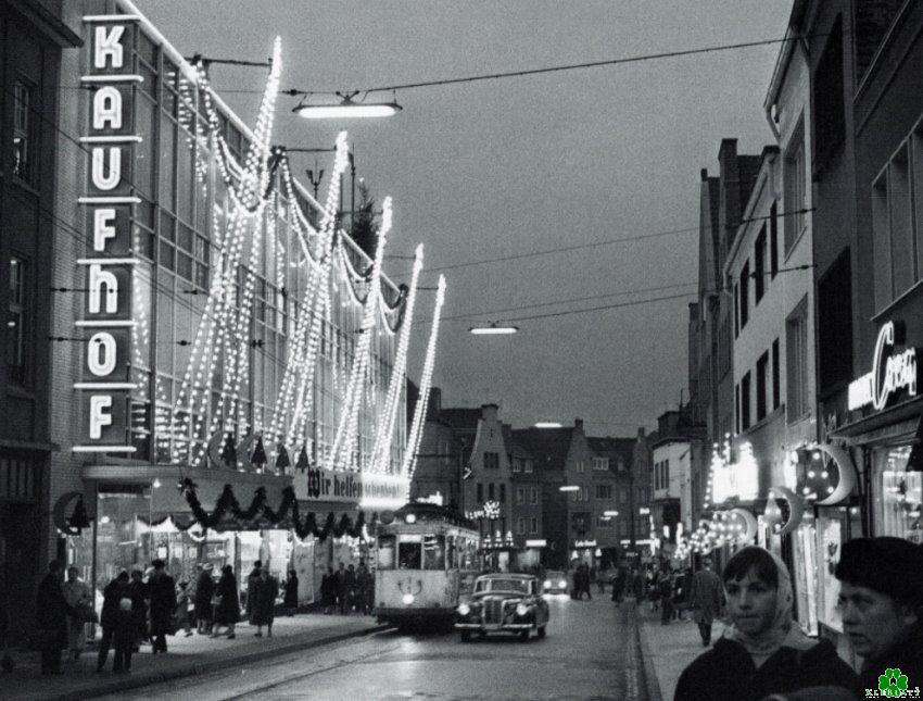 Entstand dieses Bild vor oder nach Weihnachten? Eine städtische Weihnachtsbeleuchtung ist nicht zu entdecken. Möglicher Weise waren die Kosten vor etwa 60 Jahren nicht zu stemmen. Weiß jemand Näheres?