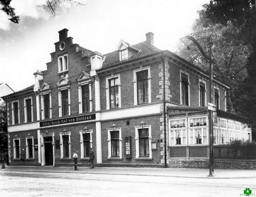 Dann ist derjenige mittlerweile auch ganz schön in die Jahre gekommen. Wir sehen hier das damalige Hotel Kock Hof von Holland. Zur Orientierung: Wir befinden uns auf der Tiergartenstrasse. Rechts vom Anbau des Hotels geht es die Gruftstrasse hoch.