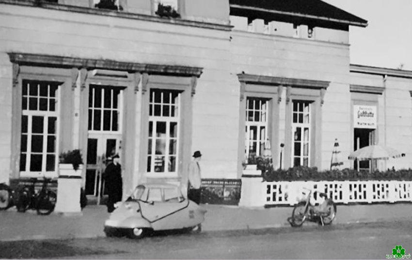 Wenn man etwas genauer hinschaut, müssten erfahrene Klever:innen schnell wissen, wo wir uns hier befinden. Ein wundervoller Kabinenroller parkt hier vor dem Hauptportal. Rechts davon erkennt man eine Gastwirtschaft mit Außengastronomie. Einiges davon hat sich bis heute nicht verändert.