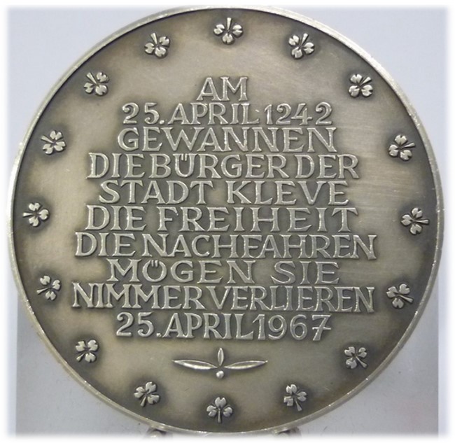 Freiheit für alle Klever Bürger/innen Im April 1242 gewannen die Bürger/innen der Stadt Kleve bereits die Freiheit, was durch eine Gedenkmedaille im Jahre 1967 nochmal dokumentiert wurde.