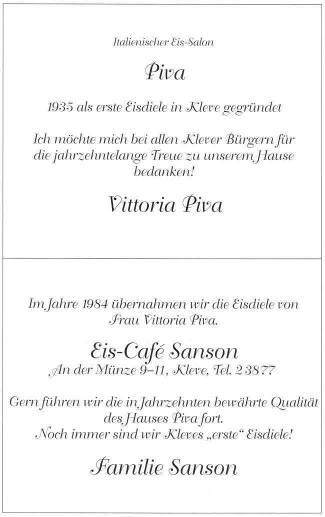 Bekannt? Als Eis-Salon Piva zu Eis-Cafe‘ Sanson wurde Immerhin gab es Piva, wie man den Klever Eis-Salon nannte, fast 50 Jahre in der Stadt, bis 1984 die Familie Sanson das Unternehmen übernahm.