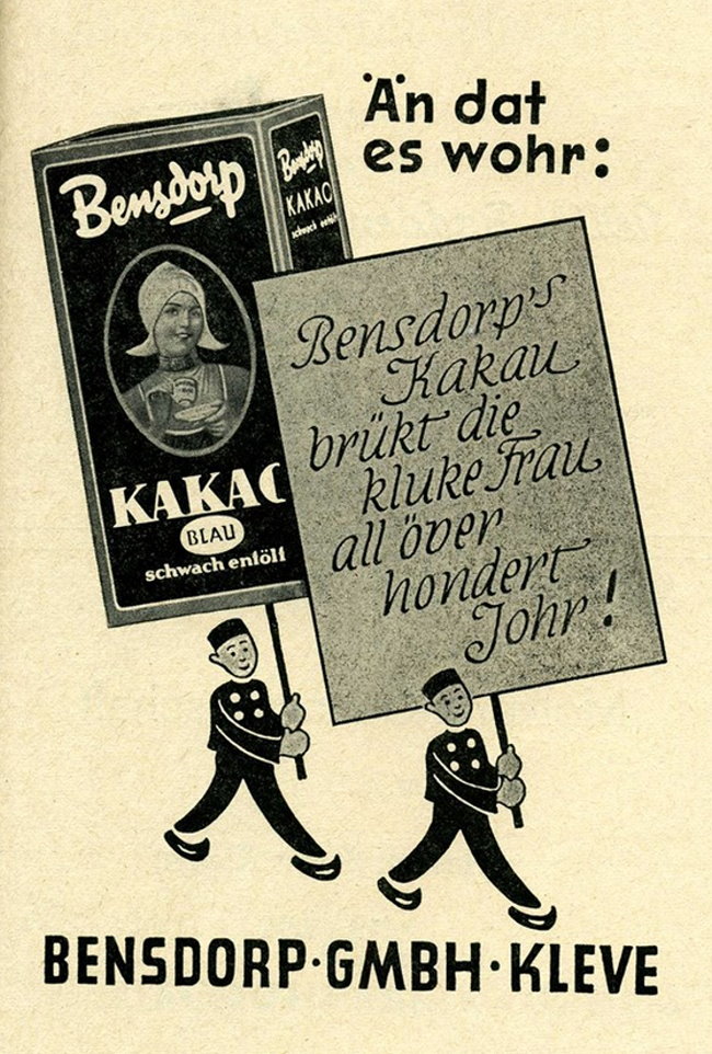 Irgendwann versuchten Klever Firmen ihre lokale Werbung in Klever Platt zu formulieren, was nicht immer wirklich gelang. Hier sehen wir ein Beispiel der Schokoladen-Fabrik Bensdorp für den schwach entölten Kakao Blau. Eieiei…