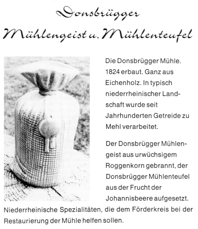 Zur Restaurierung der Donsbrügger Mühle ließen sich die Verantwortlichen so einiges einfallen. Unter anderem bot man zwei als „Niederrheinische Spezialitäten“ genannten Getränke an. Der „Donsbrügger Mühlengeist“ wird aus Roggenkorn gebrannt und der Donsbrügger Mühlenteufel ist ein so genannter „Aufgesetzter“ aus der Frucht der Johannesbeere.
