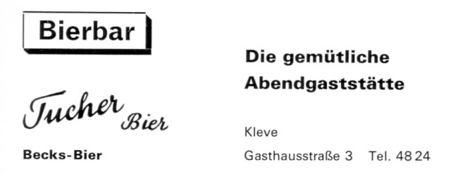Warst Du jemals in der Bierbar von Kleve? Einige werden sich noch an die Bierbar von Kleve erinnern. Sie befand sich am Anfang der Gasthausstraße, wie diese Werbung aus dem Jahre 1963 zeigt.