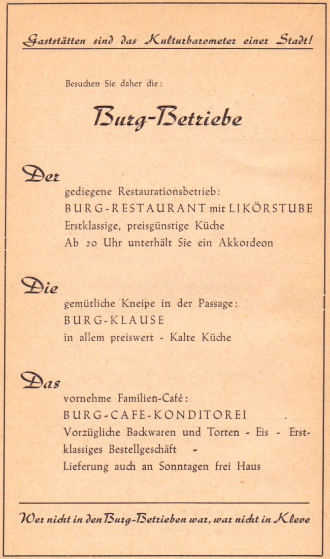 Es gab ja nicht nur das Lichtspielhaus „Burgtheater“, sondern es gab auch die Burg-Betriebe in Kleve, wie man dieser alten Werbung entnehmen kann.
