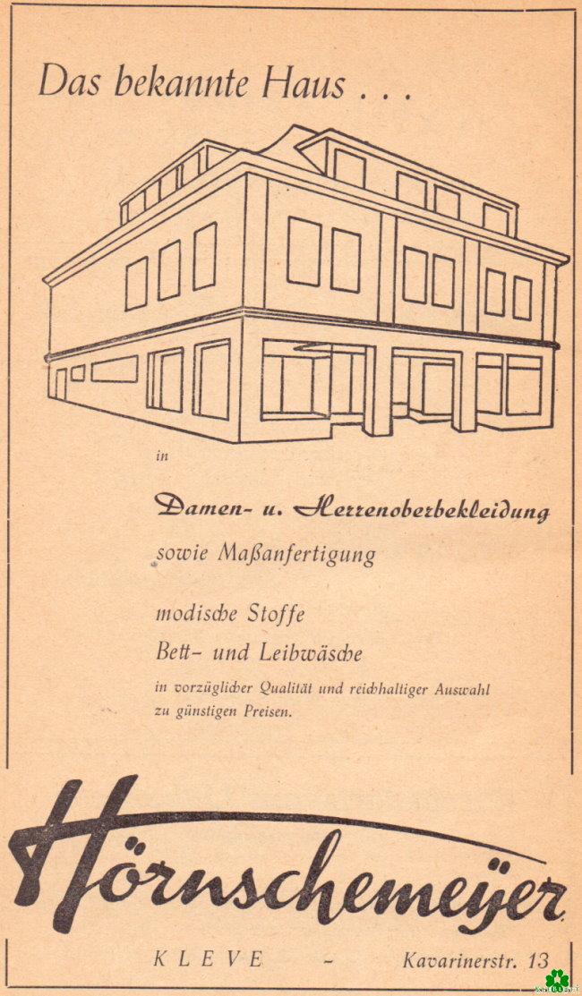 Die Frage ist, wer sich noch an das Bekleidungsgeschäft Hörnschemeyer erinnern kann. Es befand sich auf der Kavarinerstraße 13. Die Werbung zeigt eine Perspektiv-Zeichnung des Hauses. Heute sieht es selbstverständlich ein wenig anders dort aus.