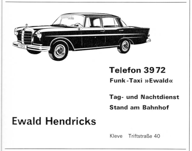 Ein Klever Taxi namens „Ewald“ Nun – das gab es tatsächlich einmal in den Sechzigern in Kleve. Das Funk-Taxi „Ewald“ stand am Bahnhof und war wohl 24 Stunden im Einsatz.