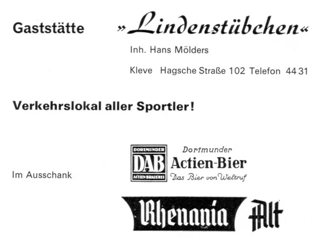 Hast Du hier auch mal ein Bierchen getrunken? Die Gaststätte „Lindenstübchen“ in Kleve wartete mit dem einzigartigen Werbeslogan auf: „Verkehrslokal aller Sportler!“ Na, das hatte doch mal was! 🙂