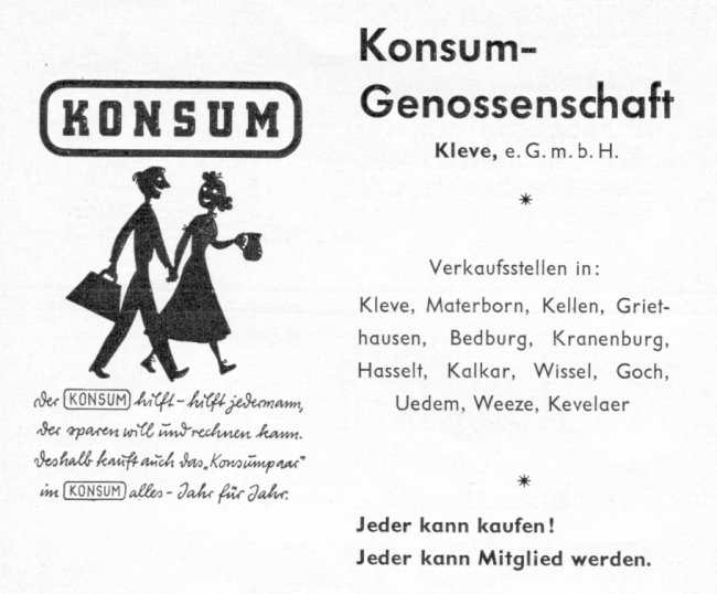 Obwohl die Genossenschaft, die in der Hauptsache Lebensmittelgeschäfte, Gaststätten und Produktionsbetriebe in der damaligen DDR unterhielt, wurde das Konsum auch in Kleve zum Synonym für günstigen Einkauf.