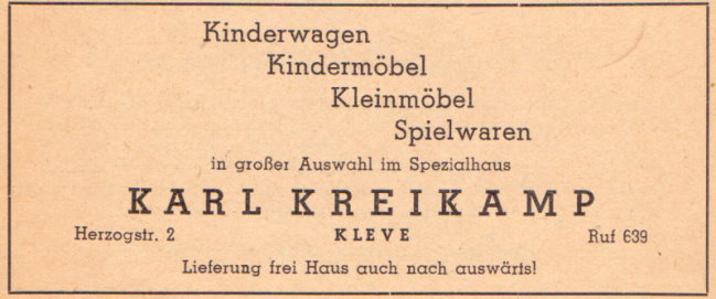 …denn Kreikamp war wohl das erste Geschäft in Kleve, welches nach dem Krieg Spielwaren für Kinder anbot. Anfang der Fünfziger drückte man sich daher vor dem Schaufenster die Nase platt. Es war alles so wunderschön, doch wer konnte sich das Meiste von der Auslage damals schon leisten? Trotzdem ein wahres Kinderparadies angesichts der Amazon- und Zalando-Generation.
