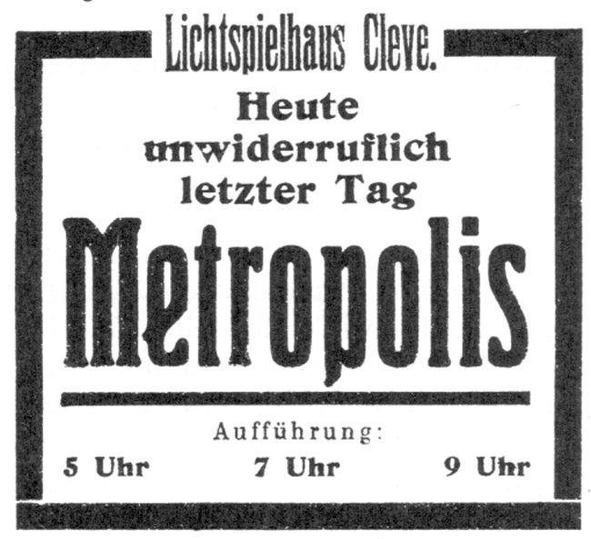 Als es das Burgtheater noch nicht gab und das Kino schlicht ein Lichtspielhaus in Cleve war, zeigte man natürlich auch den legendären Streifen von Fritz Lang: Metropolis. Das war bereits im Jahre 1927 und die Kinofreunde mussten früh aufstehen (zwischen 5 und 9 Uhr, wie man lesen kann), um sich den Film rein zu ziehen. Oder kannte man damals noch nicht die Zeitangaben über die 12 hinaus? 😉