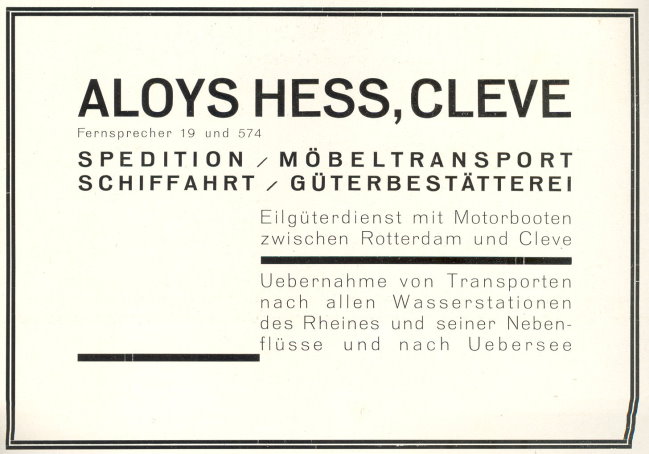 Das es einmal durch Motorboote zwischen Rotterdam und Kleve einen regen Schiffsverkehr gab, kann man sich heute überhaupt nicht mehr vorstellen. Aber es gab ihn. Wie wir hier sehen, betrieb die Spedition Hess auch eben diesen Eilgüterdienst mit Motorbooten. Der Transport ging erstaunlicher Weise sogar bis nach Übersee. Von Kleve aus. Mit Waren und Gütern aus Kleve. Hammer!