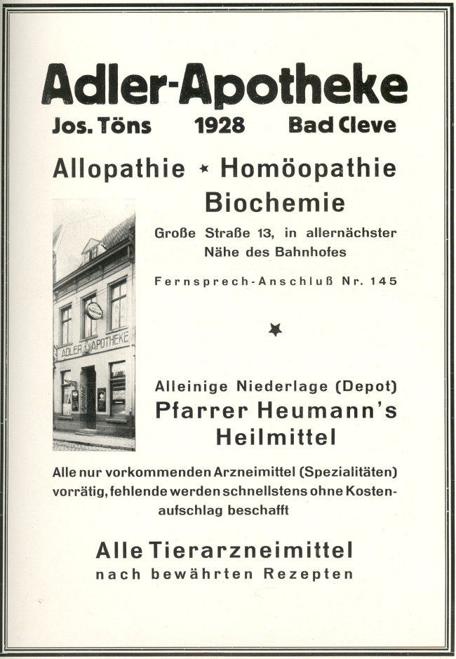 Neben Pfarrer Heumann’s Heilmittel aus Bad Cleve gab es im Jahre 1928 noch Allopathie, Homöopathie und Biochemie in der Apotheke von Jos. Töns, wie man hier nachlesen kann. Man drückte sich damals noch etwas anders aus als heute. So handelte es sich um die alleinige „Niederlage“. Kluger Weise hatte man als Verdeutlichung schon „Depot“ in Klammern hinzu gefügt.