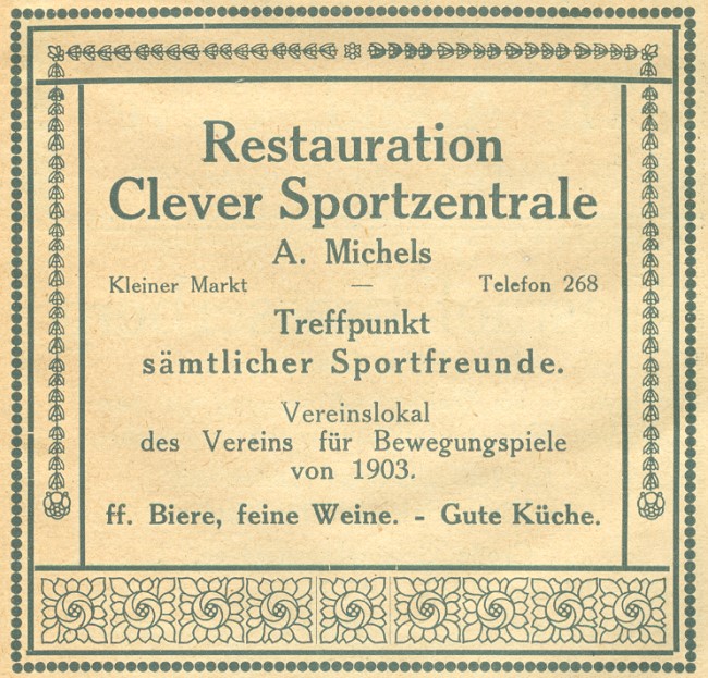 Gekannt? Restauration Clever Sportzentrale Es war wohl das erste Vereinslokal des VfB Kleve 03 und befand sich am Kleinen Markt. Laut Werbung galt es aber als Treffpunkt für sämtliche Sportfreunde. Welch ein Glück. 🙂