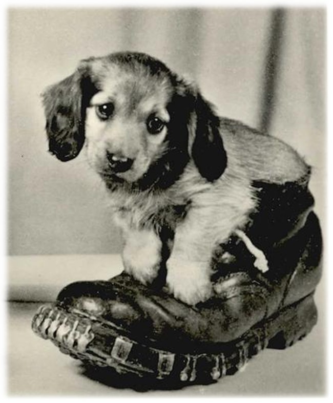 Der kleine Hund war hier wohl Nutzniesser der Schuhmacherkunst, obwohl sein Gesichtsausdruck auf andere Sehnsüchte schließen lässt.