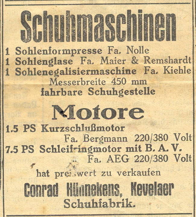 Die Schuhmaschinen kamen wohl aus Kevelaer um die Klever Schuhmacher mit den neusten Errungenschaften der Schuhindustrie zu beglücken.